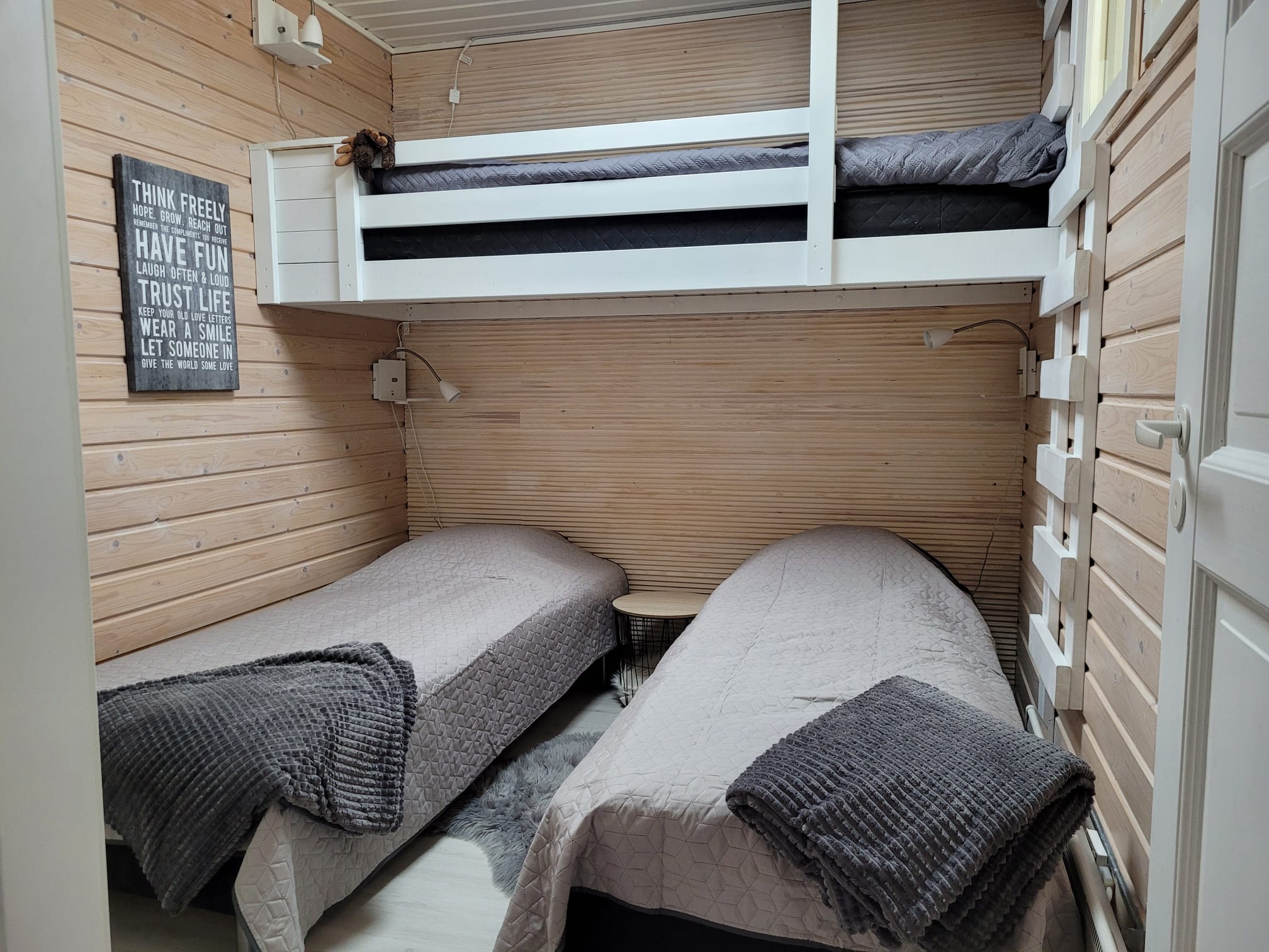 Yhdessä tasossa olevassa paritalohuoneistossa on avara ja valoisa tupakeittiö-olohuone. Huoneistossa on kaksi makuuhuonetta, joista toisessa on parisänky (160x200cm) ja toisessa kaksi runkopatjasänkyä (80x200cm) sekä lisäksi 80cm levyinen parvisänky (emme suosittele tätä isokokoiselle aikuiselle). Olohuoneen sohva muuttuu kahdella liikkeellä 140x200cm vuoteeksi kahdelle.